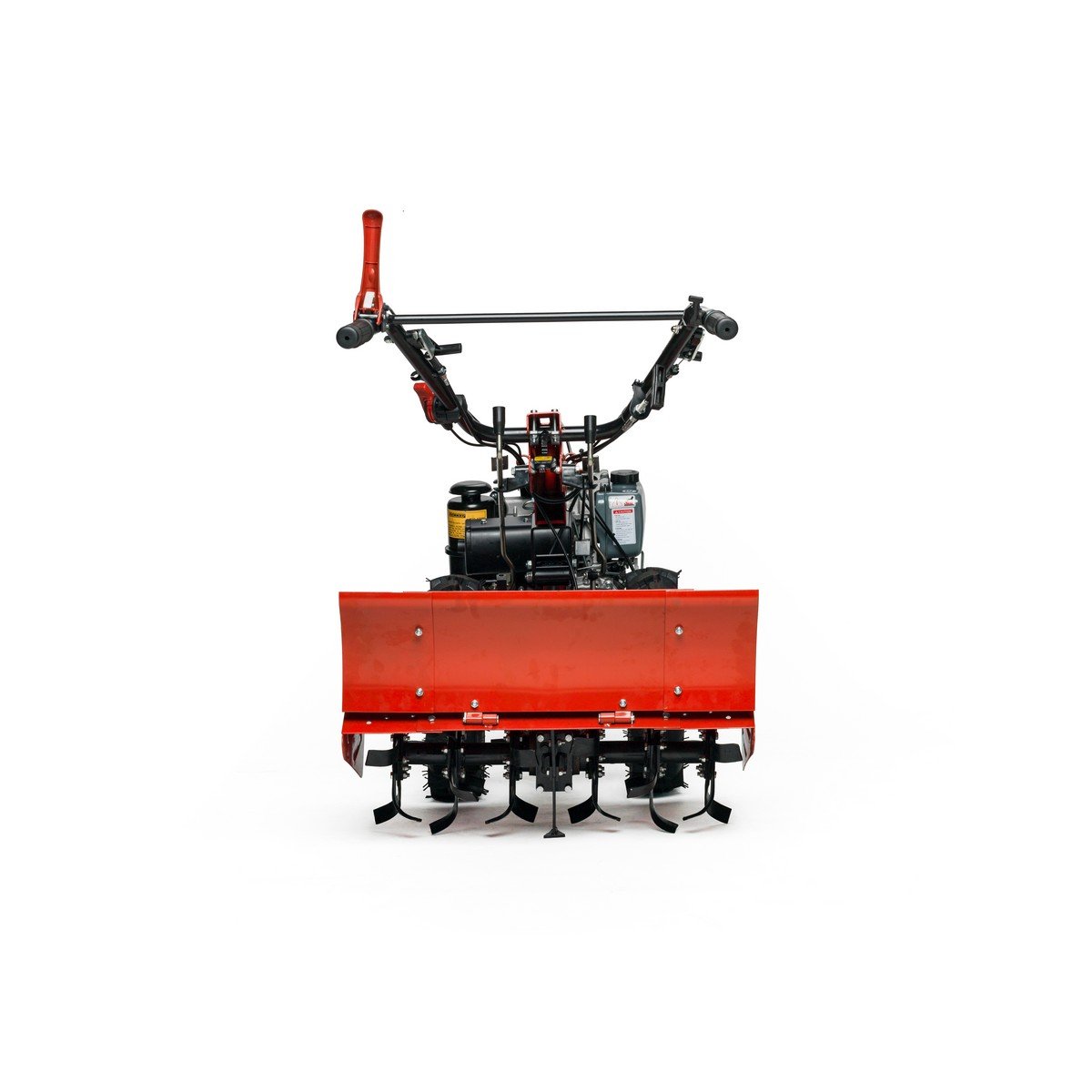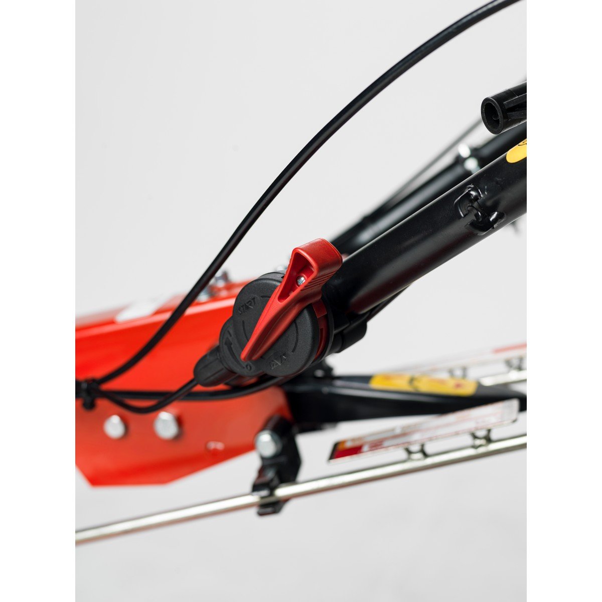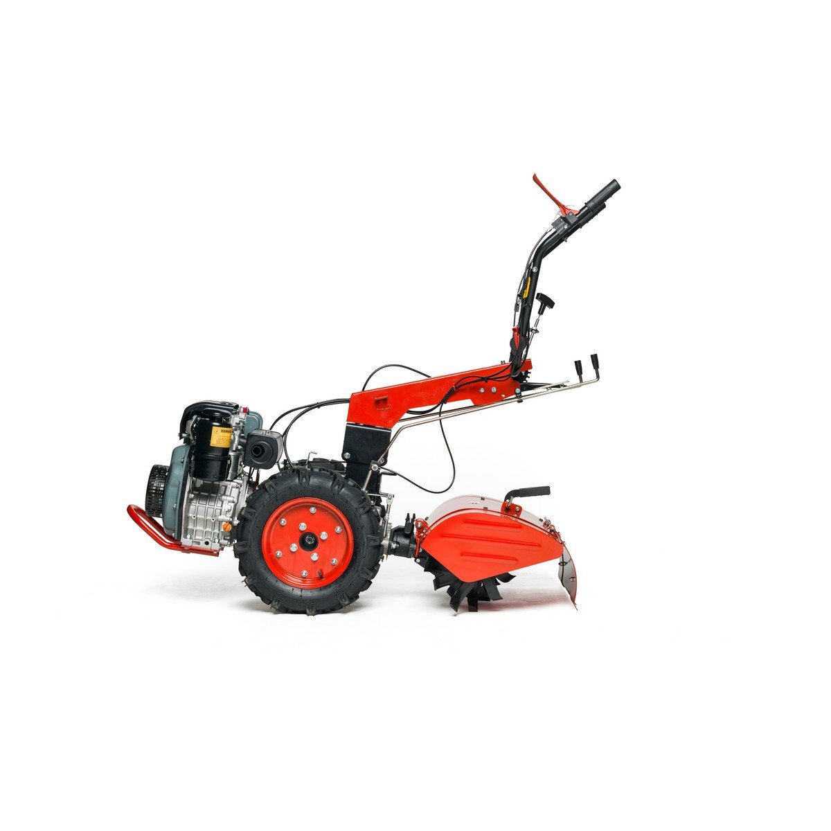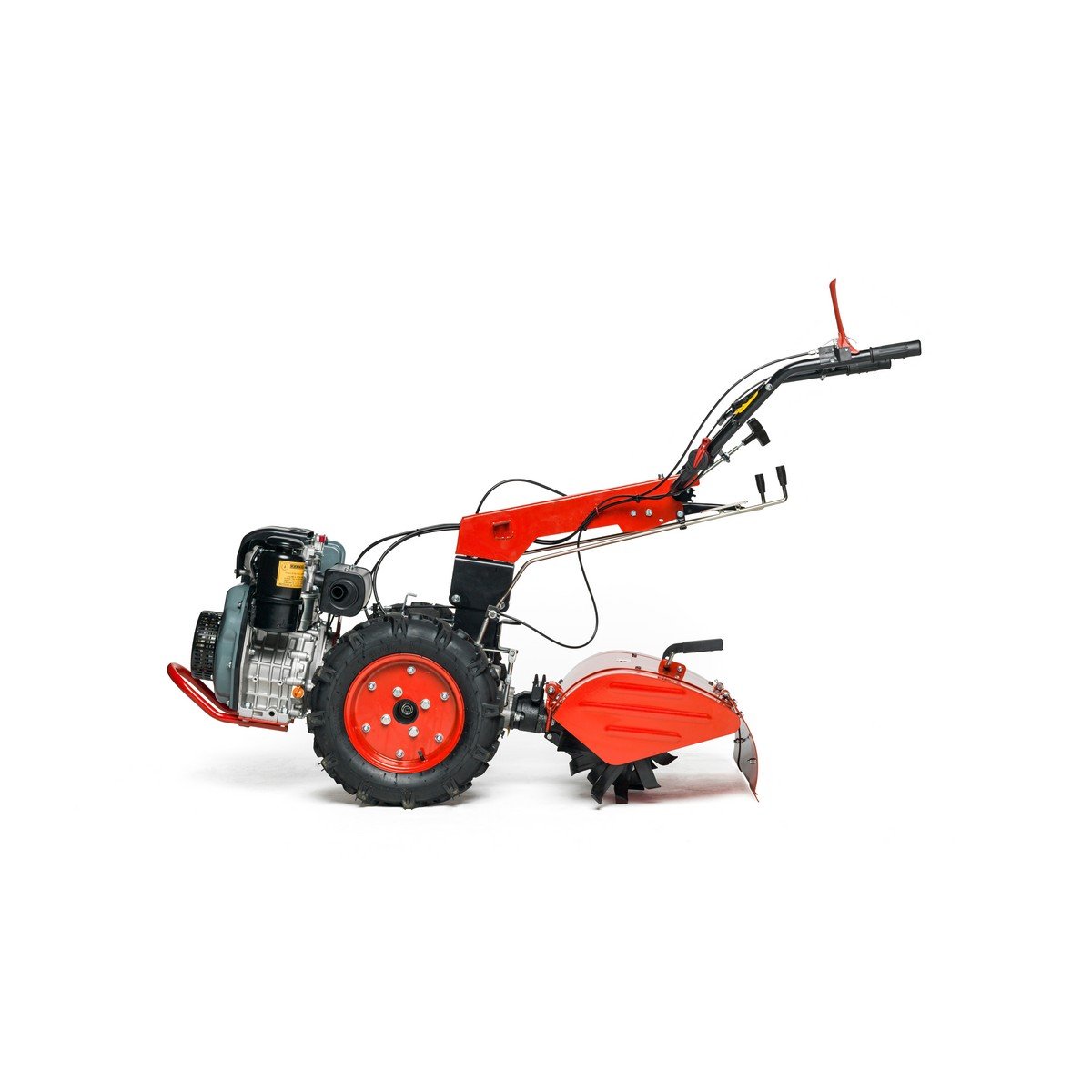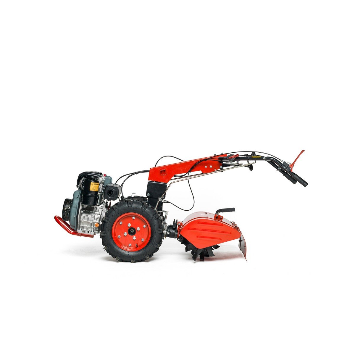 La máquina base incluye las ruedas neumáticas y el grupo fresa (rotovator) trasero. Los accesorios extra como la barra de siega, el arado o el aporcador se venden por separado para que configures la máquina a tu gusto.